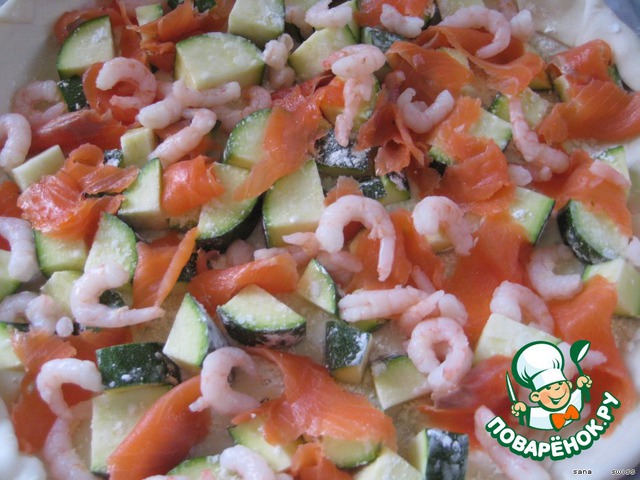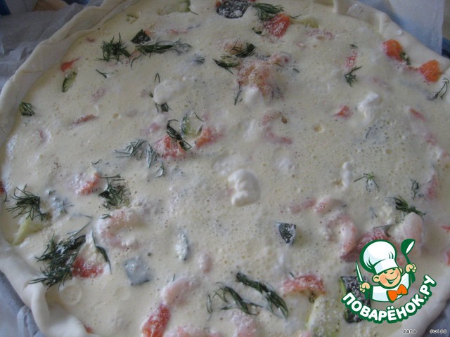Сливки взбить с молоком, сахаром, солью и яйцами и вылить на начинку.