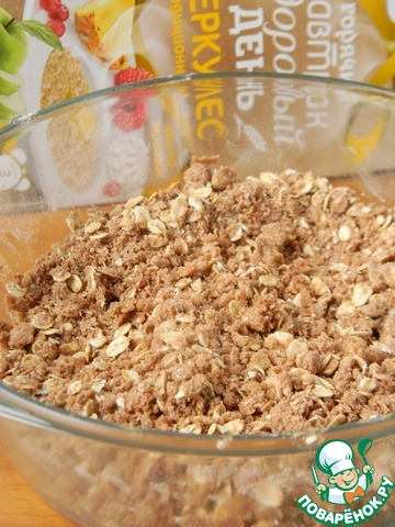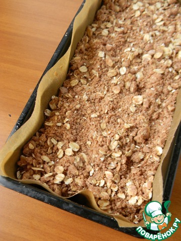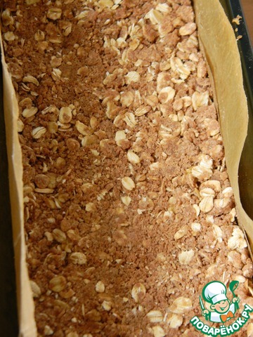 Форму застелить бумагой для выпечки, выложить половину овсяной крошки, немного примять.