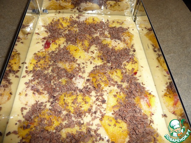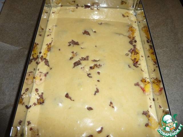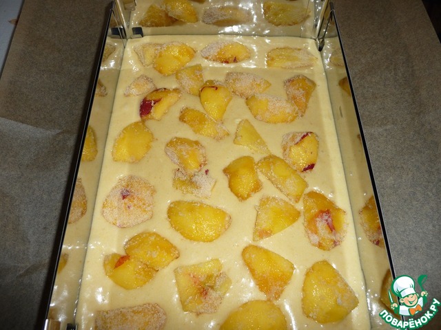 | Нежный, ароматный сладкий пирог с персиками и шоколадом. Для выпечки пирога, я использовала раздвижную рамку. |