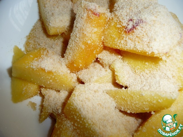 Персики очистить, порезать небольшими кусочками, засыпать сухарями панировочными.