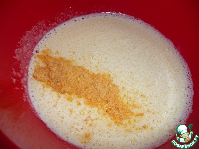 Продолжая взбивать, добавить цедру апельсина. Влить кефир.