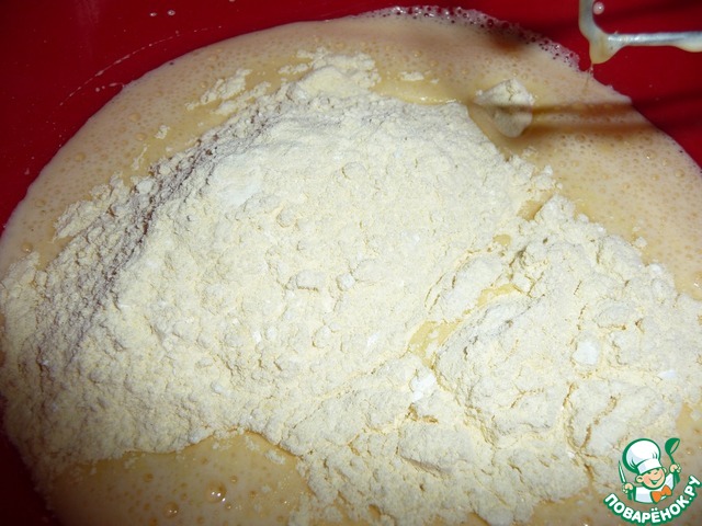 Сухую смесь добавить в яичную и продолжить взбивание.