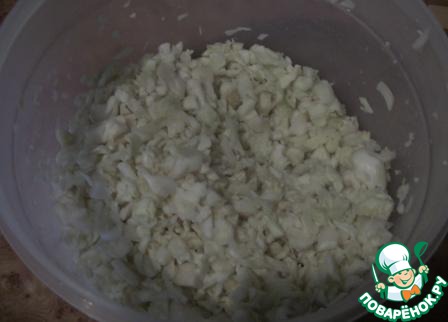Капусту мелко нашинковать, посолить и хорошо руками приминаем.