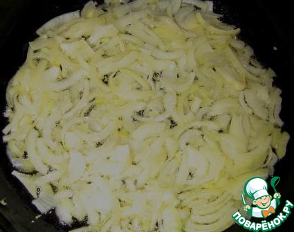 Лук порезать полукольцами и обжарить в растительном масле до прозрачности. Когда лук будет готов, снимаем со сковороды.