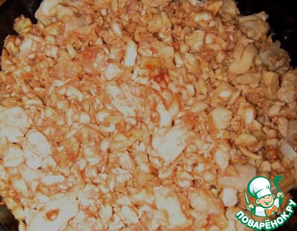 В сковороду добавляем капусту, томатную пасту и рыбу. Немного все обжариваем, достаем со сковороды и перемешиваем с луком.