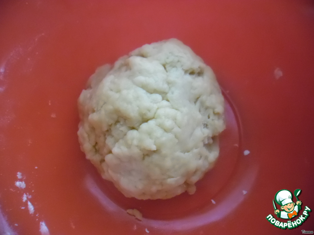Замесить песочное тесто. Для этого растереть 70 г масла с 260 г муки, добавить сахар (1,5 ст.л), 1 яйцо и 3-4 ст.л. воды.