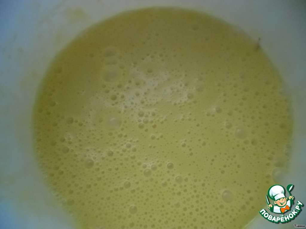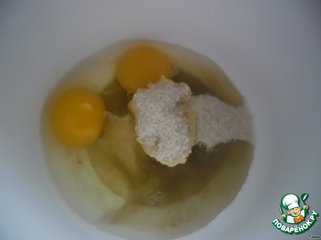 Итак, 2 яйца взбить с оставшимся маслом и 3-4 ст. л. сахара.