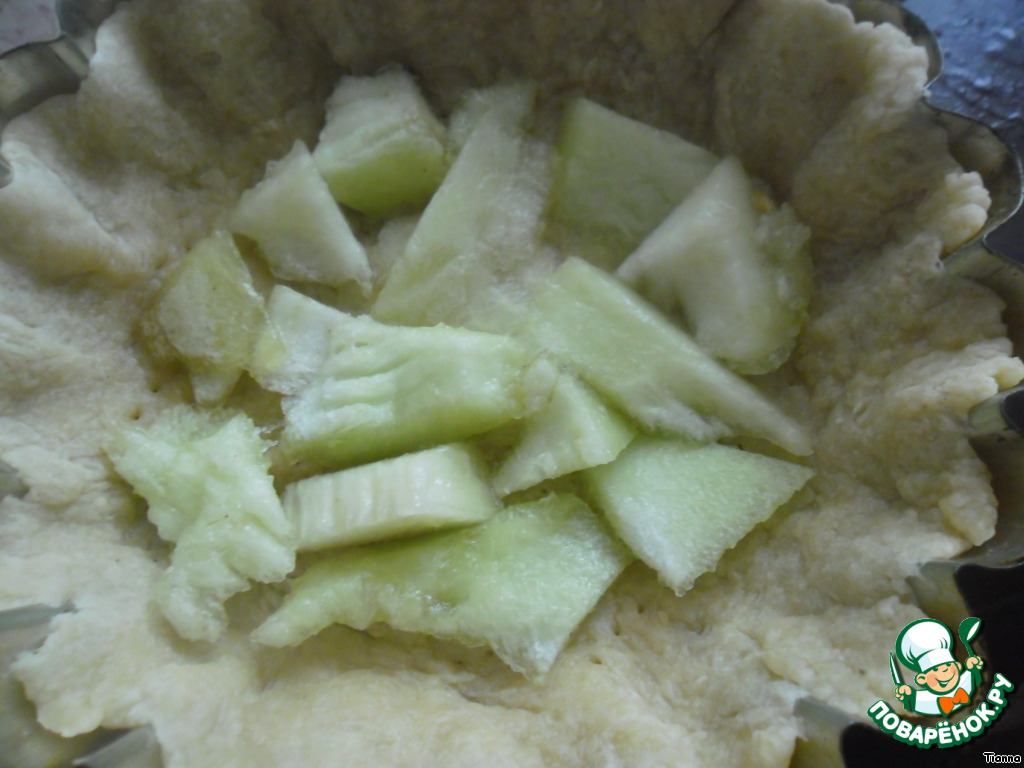 Вынуть из духовки форму с песочной основой. На дно выложить кусочки дыни (фруктов)