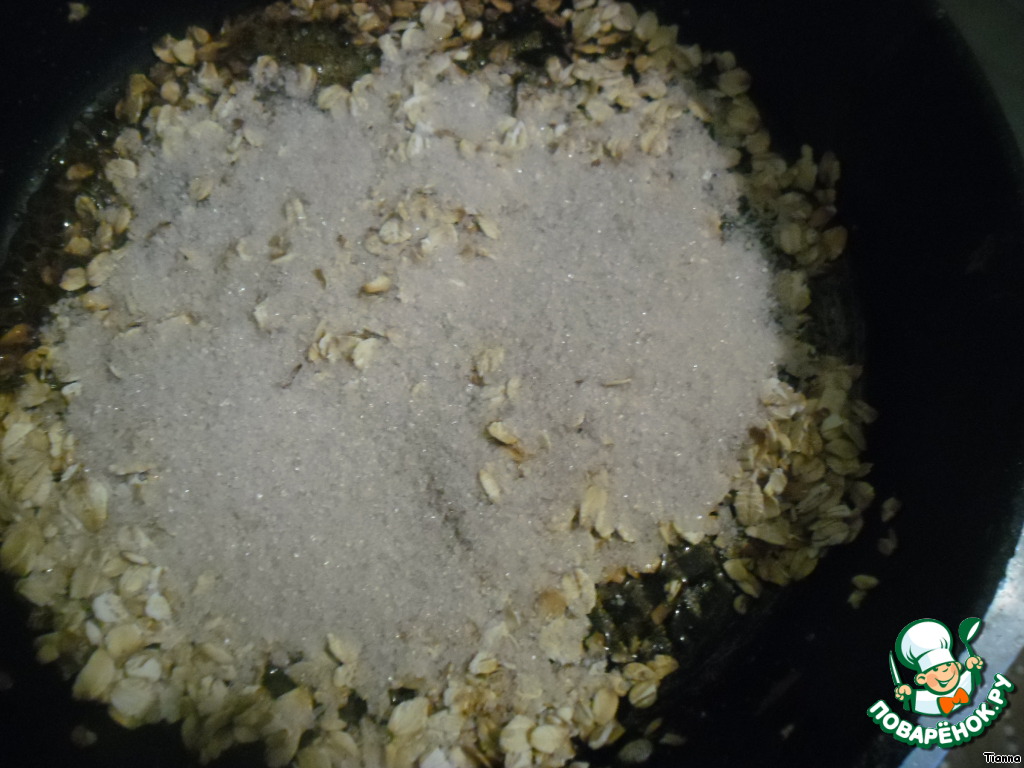 Теперь очередь за хлопьями. Их следует немного поджарить на сухой сковороде. Когда они приобретут коричневый оттенок нужно добавить сахар (2-2,5 ст.л.) и 1 ст. л. воды. Постоянно помешивая, добиться расплавления сахара. Затем снять сковороду с огня, добавить мед и перемешать.
