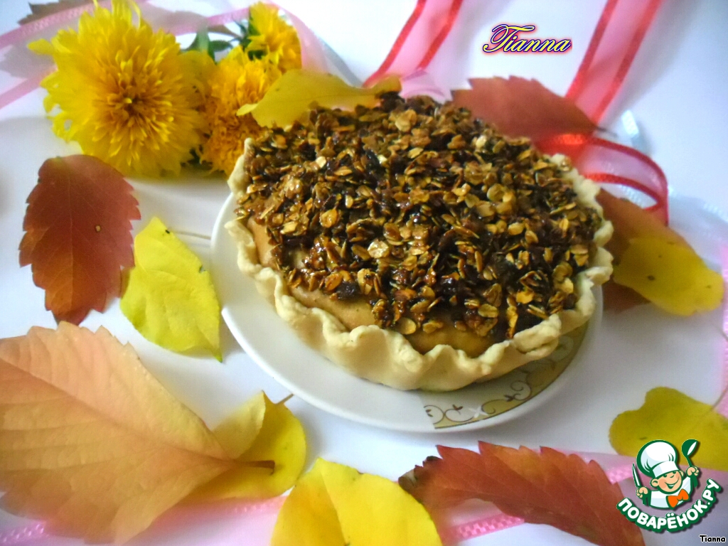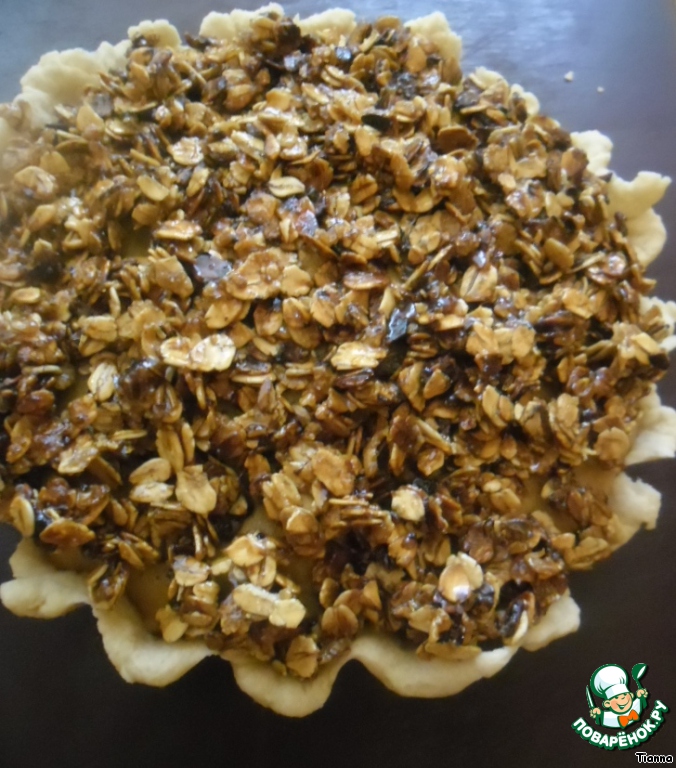 Горячие карамелизированные хлопья выложить на поверхность пирога.