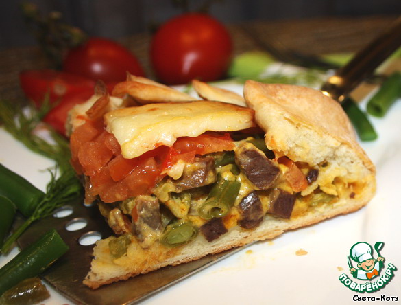 Тесто раскатать. Выложить на смазанный маслом противень. В центр, горкой, помещаем «сердечно-фасолевую» начинку, сверху помидоры и ломтик колбасного сыра, толщиной не более 5 мм.