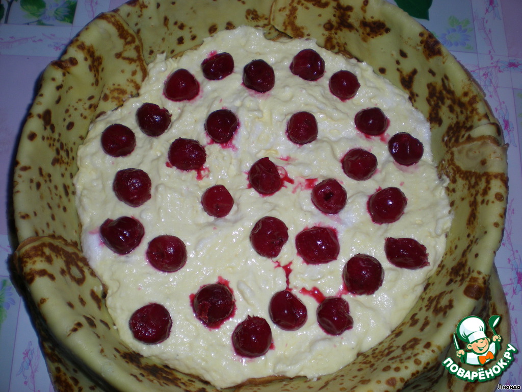 Выложить половину начинки в форму. Сверху распределите вишню. У меня была замороженная без косточек. Накройте начинку сверху блином.