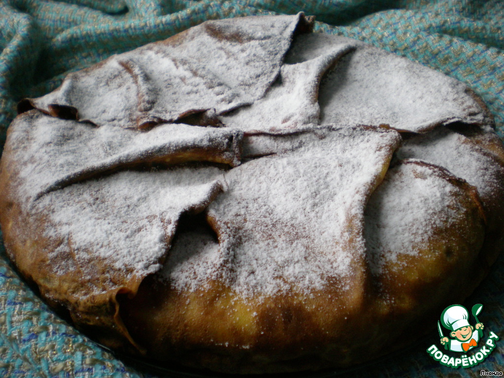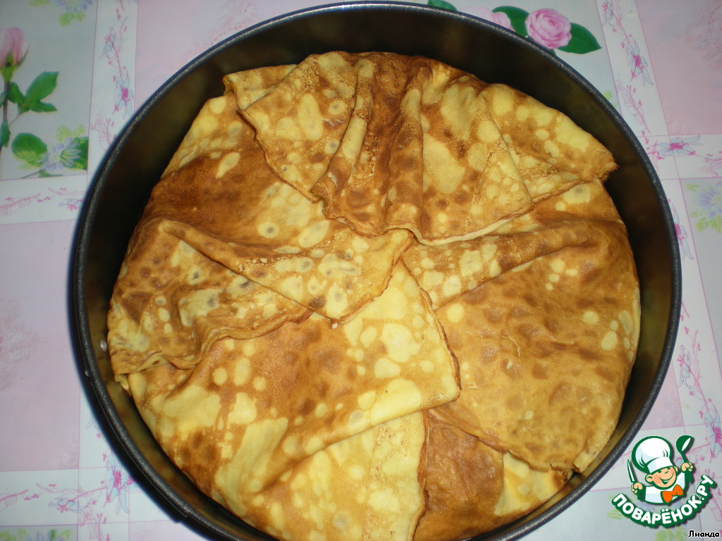 Закройте начинку свисающими краями блинов. Выпекайте 40 мин. при температуре 180*. За 15 мин. до окончания выпечки накройте пирог бумагой.
