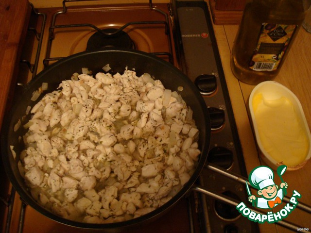 Лук пассеровать в смеси оливкового и сливочного масла ( смесь масел повышает температуру приготовления, не дает сливочному маслу гореть), добавить кусочки курицы, обжарить,