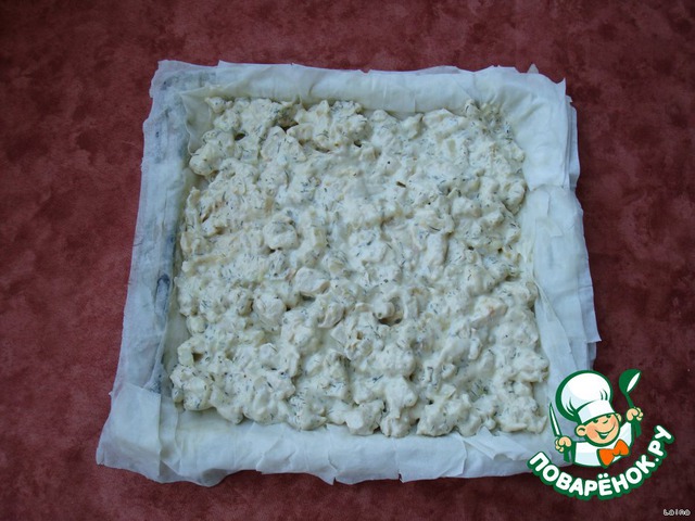 Растопить сливочное масло. Противень смазать маслом, обсыпать молотыми сухарями, выложить 5 листов фило. Каждый лист смазывать кисточкой растопленным маслом. Выложить начинку. Накрыть оставшимися 5 листами фило, каждый смазывать маслом. Подвернуть края, посыпать тертым пармезаном и сухарями.