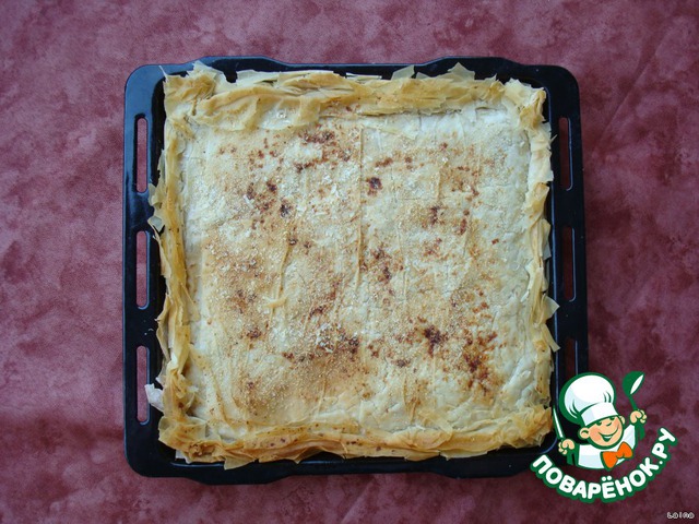 Накрыть оставшимися 5 листами фило, каждый смазывать маслом. Подвернуть края, посыпать тертым пармезаном и сухарями.