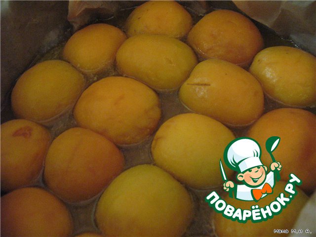 Соединить в кастрюльке с толстым дном сахар с водой, довести до кипения, помешивая ложкой, пока сахар не растворится. Оставить кипеть, не размешивая, примерно 5-8 мин, пока сироп не станет менять цвет на золотисто-коричневый. После этого снять с огня и вмешать сливочное масло (оно сначала запенится, а затем вся масса станет похожа на густую карамель). Вылить карамель в хорошо смазанную маслом неразъёмную форму, диаметром 20 см (у меня 26 см, меньше бы тесто не влезло). Половинки абрикос выложить поверх карамели срезом вниз и как можно плотнее друг к другу.