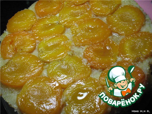Выложить массу поверх абрикос и выпекать в разогретой до 160С духовке 25-35 мин ( в моей духовке больше часа), проверяя на готовность спичкой, до золотистого цвета.