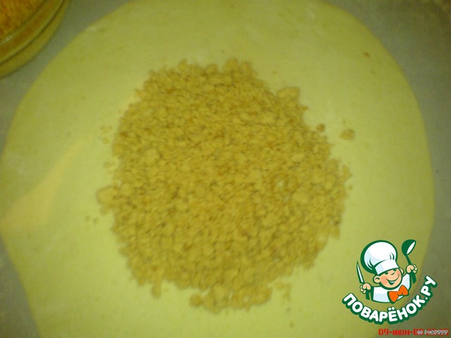 Сделала крышечку для пирога и сформировала вот такой пирог. Верх смазала яйцом и посыпала крошкой (перетереть маргарин, муку и сахар руками в крошку). Запекать в духовке на среднем огне, поскольку все свою духовку знают, до золотистого цвета.