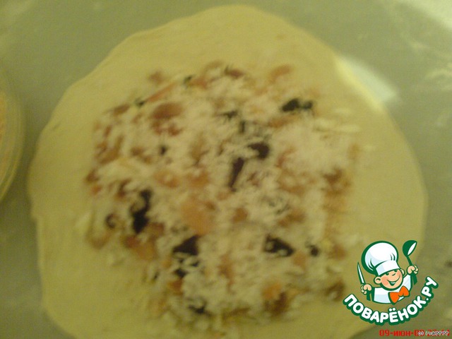 Раскатала моё тесто тоненько, примерно 0,5 см, и слоями выложила начинку.
