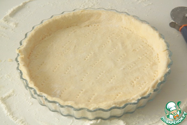 Основа киша - песочное тесто. Я всегда держу в холодильнике готовое тесто на случай прихода гостей, но если у Вас теста нет, то можно его быстро приготовить. Мой рецепт прост: 300гр. муки соединить со 100гр. сливочного масло, все порубить, добавить 100мл. натурального йогурта, немного соли и сахара. Вот и все. Готовое тесто раскатать, наколоть вилкой и отправить в разогретую до 180 градусов духовку на 10 минут.