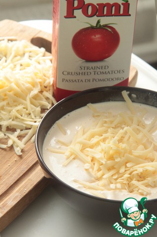 Приготовим заливку: соединим сливки, томатную пасту и половину натертого пармезана.