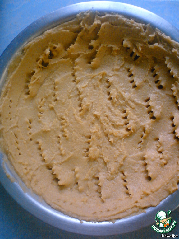 Распределим тесто в форме и наколем вилкой. Уберем его в холодильник на час. Или в морозилку на 15-20 мин. Кстати, лучше, если перед выкладыванием теста в форму форма тоже была холодная, предварительно подержите ее в морозилке, пока смешиваете ингредиенты.