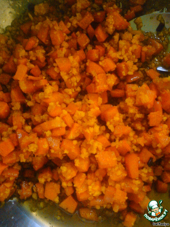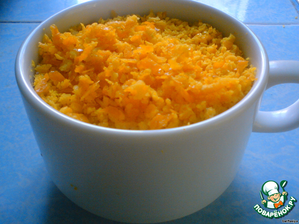 И добавим туда нарезанную кубиками половину морковки и апельсиновую цедру. Поварить до впитывания сахарного сиропа, но не слишком долго (чтобы морковь не сильно изменила цвет).