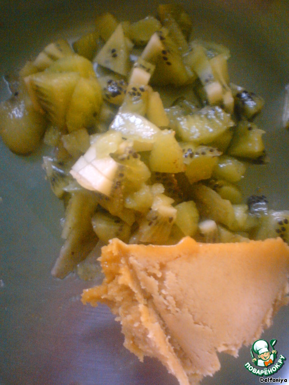 И с киви. К сиропу для киви я не добавляла воды, а сразу добавила сахар к кусочкам фрукта, так как он сам по себе достаточно сочный. Варить его совсем недолго. Так как нам нужна его сочность, а он быстро теряет влагу.