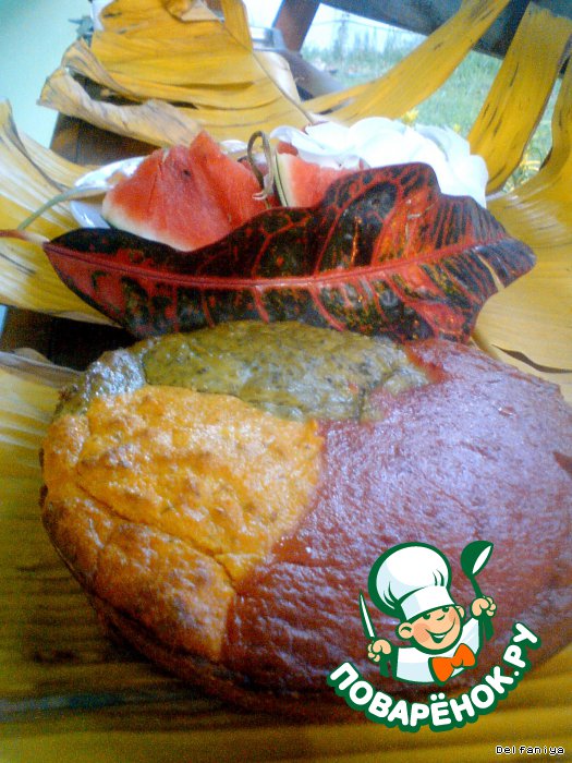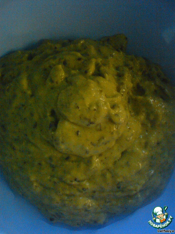 Теперь займемся суфле. Взбить желток до белой пены, добавить к нему творог, одну ст.л. муки и еще раз взбить. Разделить полученную массу на три части. Наши начинки - свекла, морковь и киви, уже готовы. Так же по отдельности их пюрировать, добавив измельченные пряности.
