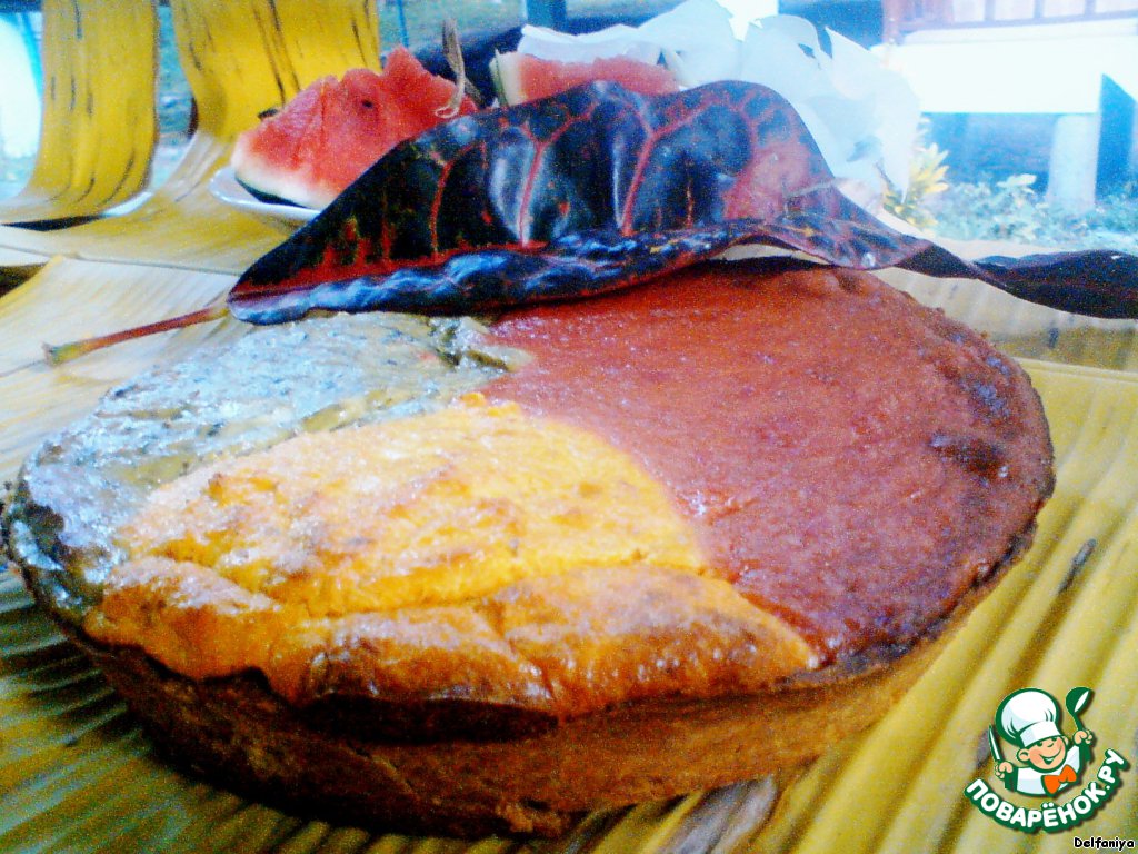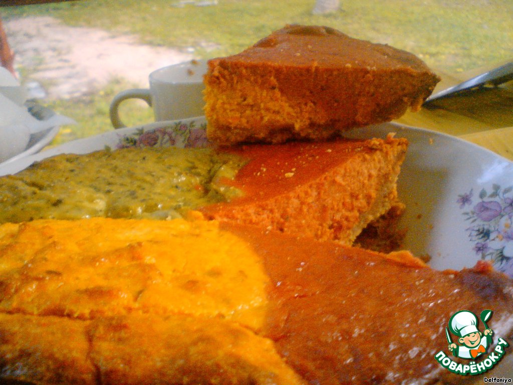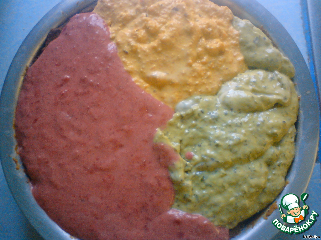Далее смешать соответственно три начинки, с тремя частями творожной массы. Затем взбить два белка до плотной пены (я для облегчения этой работы использую винную кислоту или cream of tar tar) и вмешать по 1/3 от белковой массы в каждую начинку. Выложить начинки на корж в произвольном порядке. И ставьте в духовку, теперь уже на большее время. Примерно 35-40 мин. При 170 град.