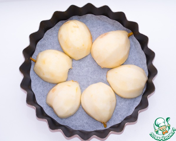 Груши почистить, разрезать пополам, удалить сердцевину. Форму для выпечки застелить пекарской бумагой, смазать сливочным маслом. Уложить груши срезом вниз.