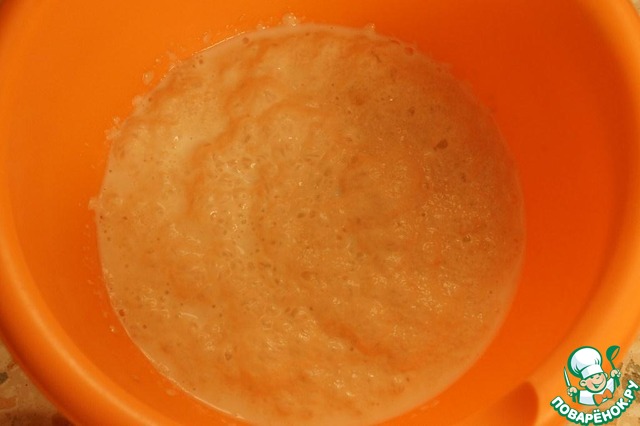 В теплом молоке (не более 40 градусов) разведем чайную ложку сахара и дрожжи. Накрываем полотенцем и ставим на 10 минут в теплое место для брожения.