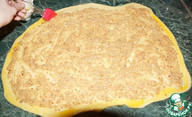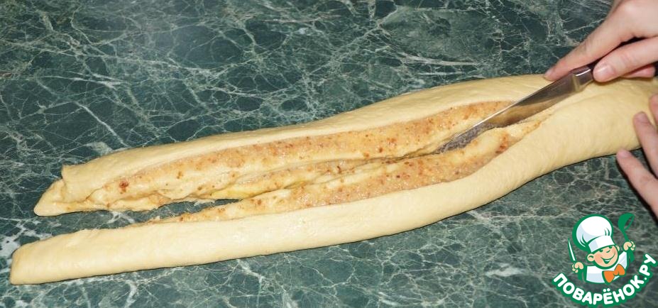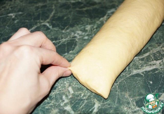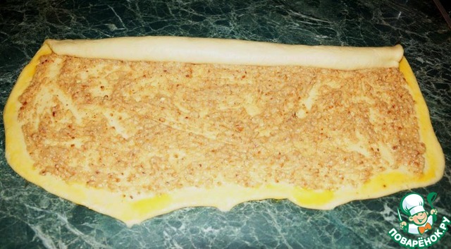 Аккуратно скатываем пласт теста с начинкой в трубку.