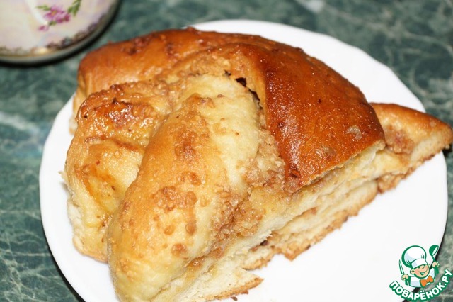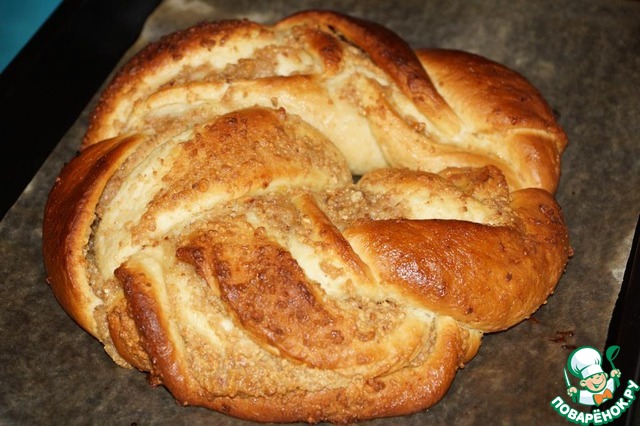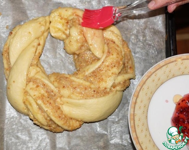 Теперь их нужно скрутить с друг другом и уложить, как подскажет фантазия. У меня - кольцом. Переносим наше изделие на противень (заранее застелить его пергаментом, смазанным маслом). Смажем участки теста без начинки сиропом от варенья.