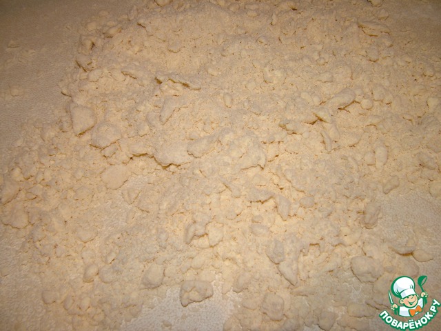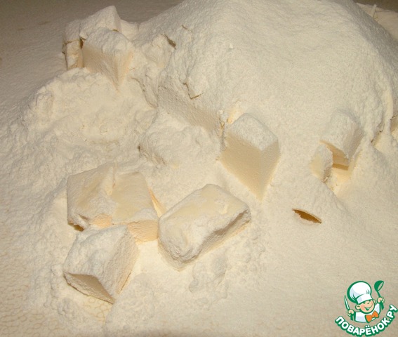 Муку просейте вместе с солью, смешайте с нарубленным маргарином.