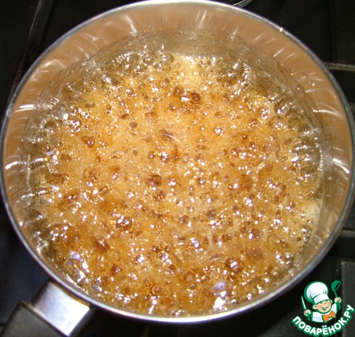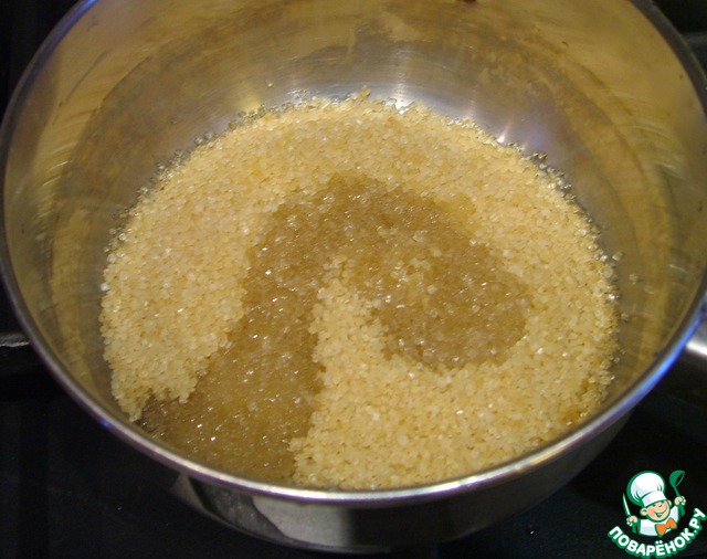 Делаем карамель. Для этого в сахар добавляем 3 столовые ложки воды, размешиваем и ставим на сильный огонь. Доводим до кипения при помешивании, а затем на маленьком огне оставляем еще минуты на 2-3. Потом выливаем карамель в смазанную маслом (постным) жаропрочную неразъемную форму.