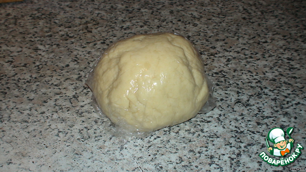 Растираем маргарин с мукой, щепоткой соли, добавляем сметану и разрыхлитель теста. Все перемешиваем и делаем колобок. Кладем наш колобок в пакет и ставим в холодильник не менее, чем на 30 мин. Я сделала вечером, а утром испекла пирог.