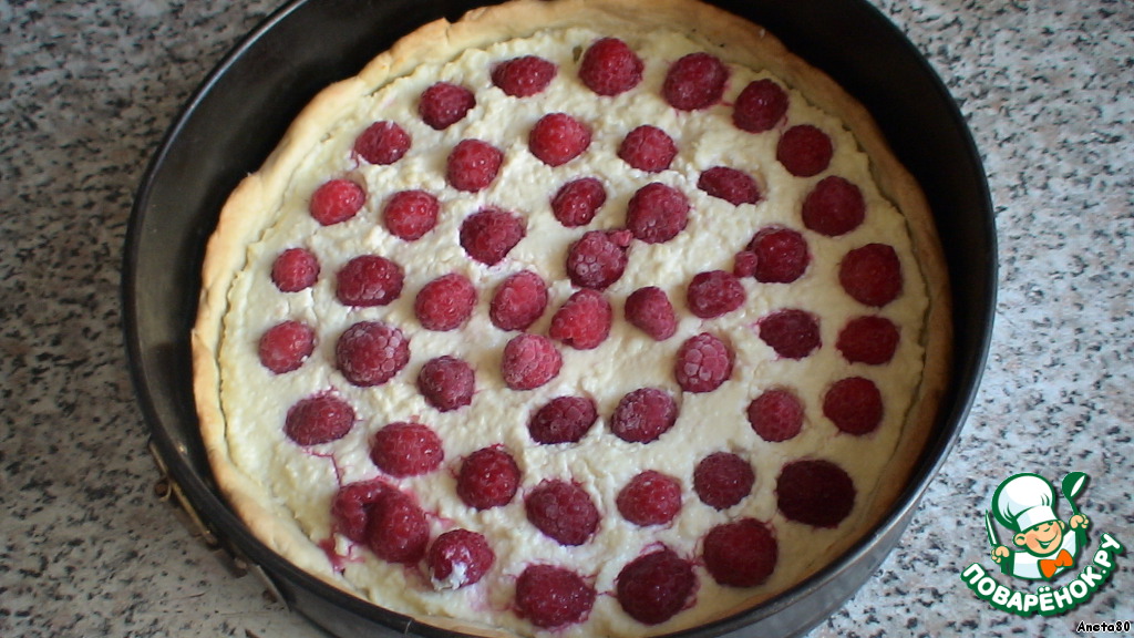 Уже готовую корзинку с творогом наполняем начинкой, в моем случае это малина