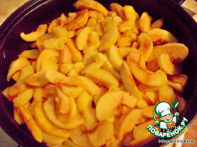 Ломтики яблок обжарить в 50 г сливочного масла и охладить.