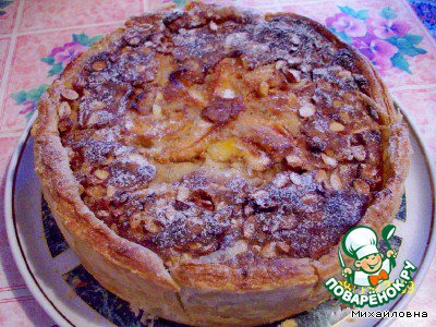 Ломтики яблок обжарить в 50 г сливочного масла и охладить. Форму смазать маслом, обсыпать мукой и выложить по дну и стенкам слоeное тесто, сверху на 3 /4 уложить яблоки. Взбить 100 г масла и сахарную пудру добела, постепенно добавить яйца, муку, 100 г молотого миндаля, выложить на яблоки. В центре уложить яблоки в форме цветка, всю поверхность вокруг засыпать нарезанным миндалем и выпекать в духовке 1 ч. Сбрызнуть коньяком, охладить, вынуть из формы и посыпать сахарной пудрой.
