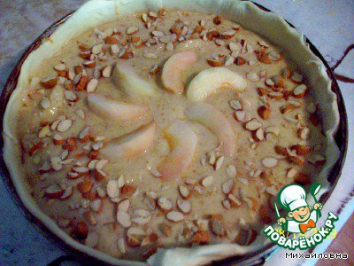 В центре уложить яблоки в форме цветка, всю поверхность вокруг засыпать нарезанным миндалем.