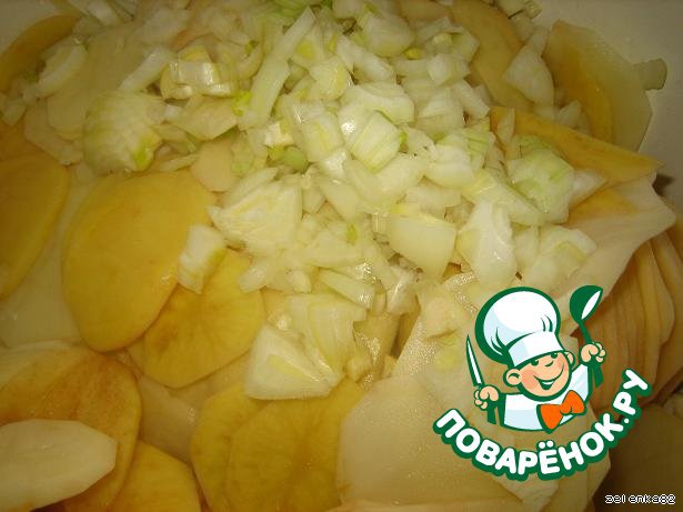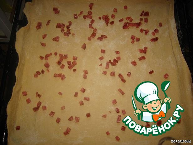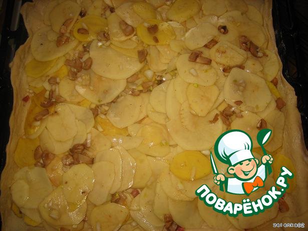 Тесто делим на две части, одну раскатываем и на противень (смазанный маслом). Далее измельчаем всю начинку и выкладываем слоями (чуток подсаливаем и перчим).