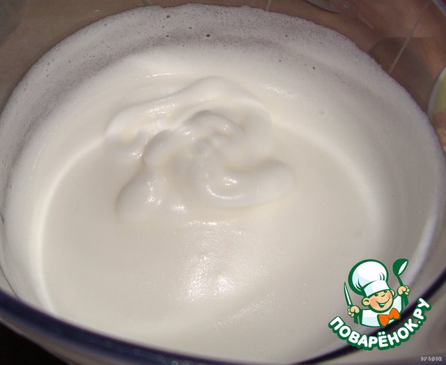 В начале взбиваем белки в пену, затем добавляем сахар и уксус, и продолжаем взбивать, пока масса не станет густой, блестящей и не будет соскальзывать с венчика.