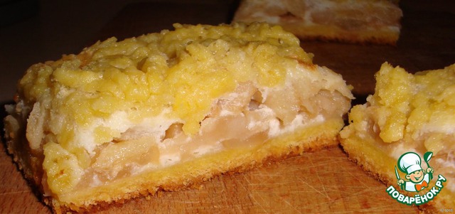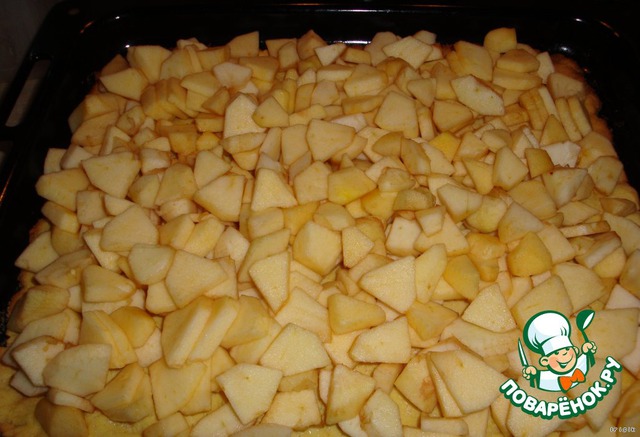 Противень вынимаем из духовки, посыпаем очищенными и нарезанными яблоками.