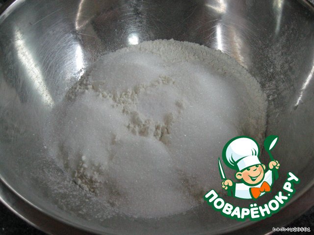 Половину муки ПРОСЕЯТЬ, добавить сахар, и чепотку соли, ПЕРЕМЕШАТЬ.