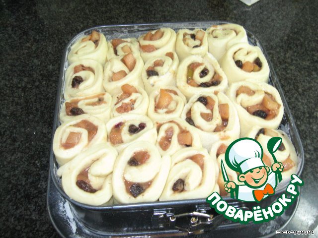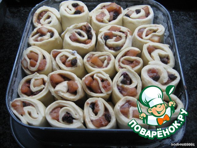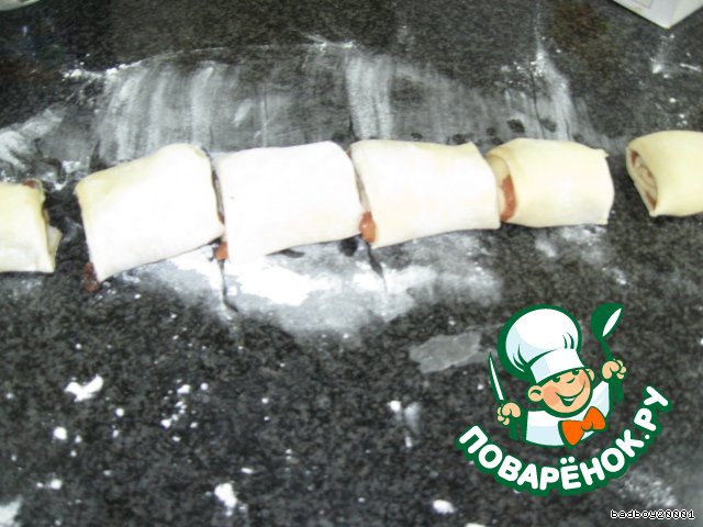 Готовое к работе тесто разделить, на 4-5 частей, раскатать, выложить начинку.