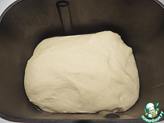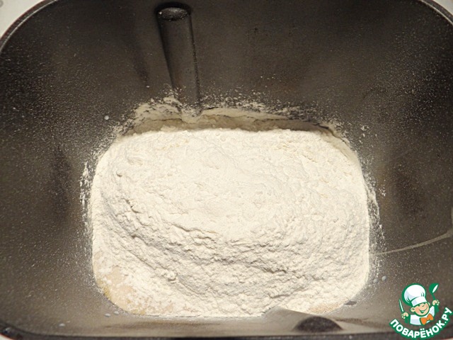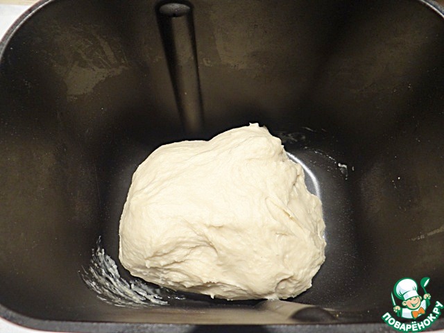 Сначала замешиваю тесто с помощью хлебопечки (можно замесить тесто и обычным способом). В ведерко хлебопечки наливаю теплое молоко, добавляю сухие дрожжи, соль, сахар, размягченное сливочное масло, яйцо, просеянную муку.