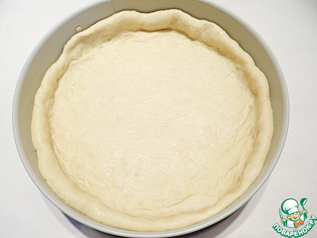 Разъемную круглую форму диаметром 25 см смазываю растительным маслом, помещаю в нее круг из теста, формуя дно и бортики. Накрываю форму пленкой и даю тесту увеличиться в объеме в 1,5-2 раза.