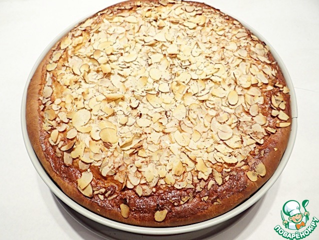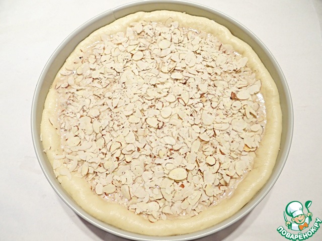 Выкладываю рисовую начинку в подошедшую основу пирога, посыпаю миндальными лепестками.